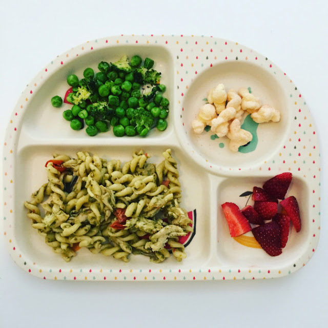 Chicken and cherry tomato pesto pasta, peas and broccoli, organic soft popped corn, strawberries.